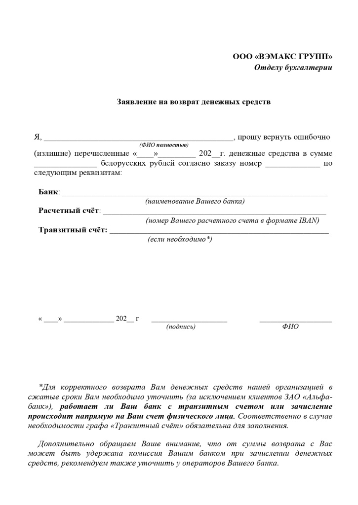 Для возврата денежных средств физическому лицу просим заполнить заявление согласно образцу и выслать на почту или в мессенджеры по телефону +375291072727